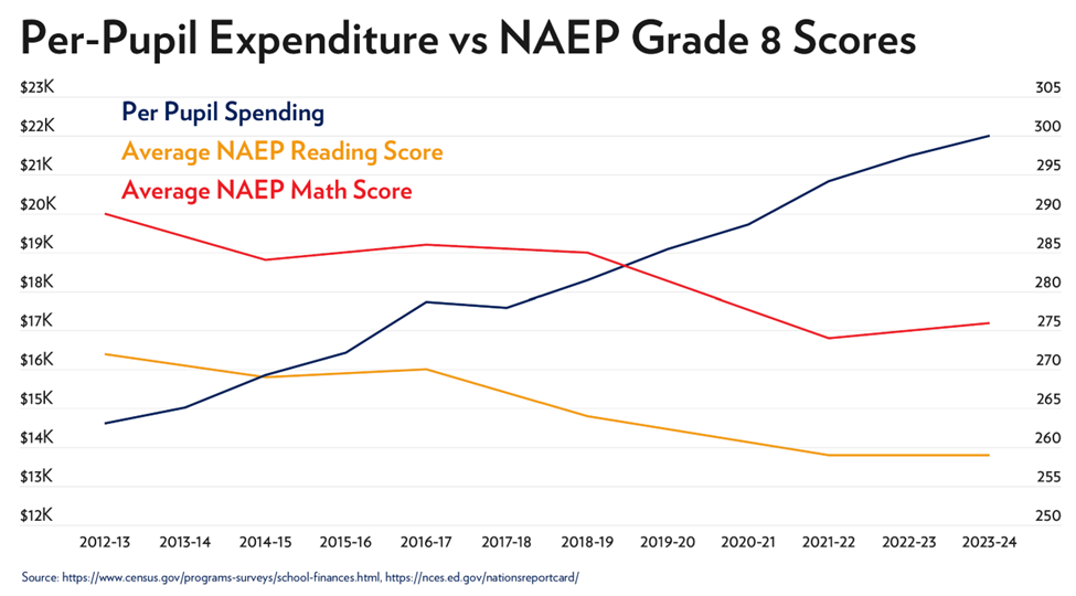 Test scores also haven’t kept pace with funding. According to the Nation’s Report Card, reading and math scores have declined by about 5 percent over the past decade.