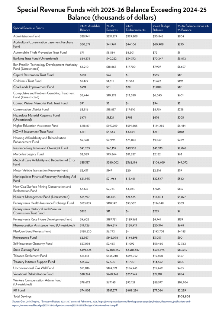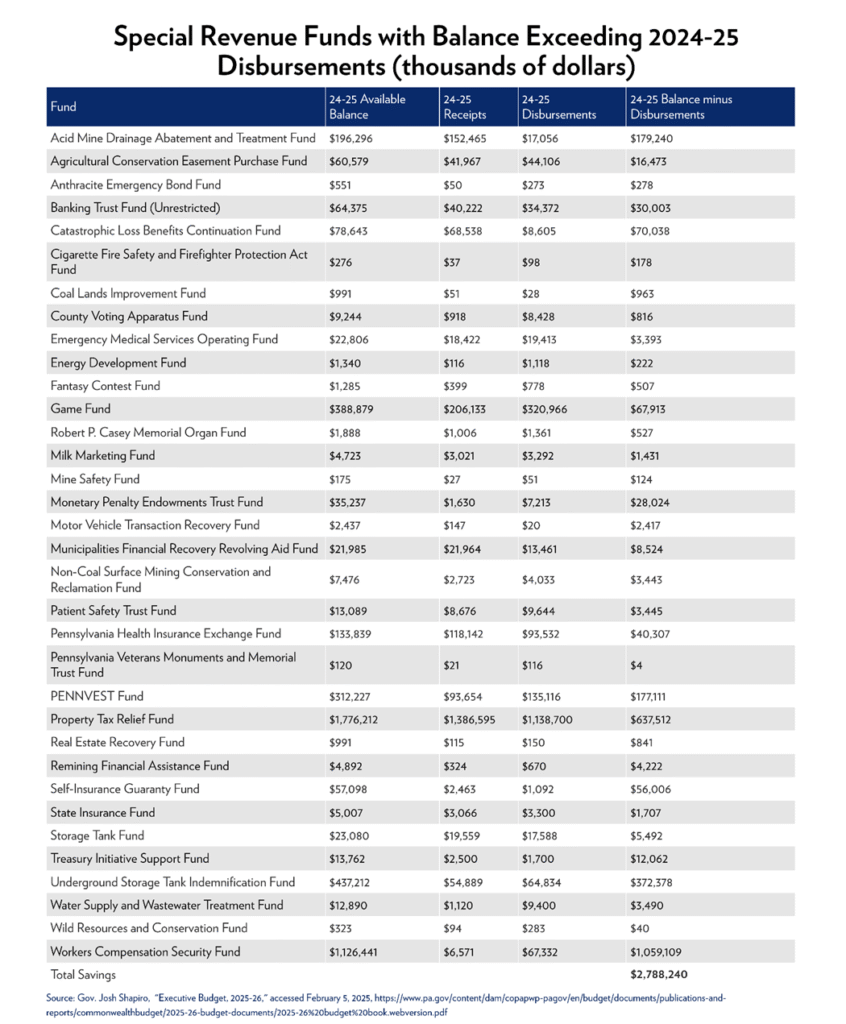 - Pennsylvania has over one hundred “Other Special Funds,” many of which have significant cash balances. Reducing fund balances to a maximum of one year of expenditures and freezing fund balance increases would allow the state to draw an estimated $2.89 billion.